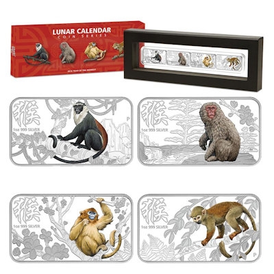 year-monkey-rectangle-set-4-oz-silber-koloriertNoch drei Wochen, dann beginnt das Jahr des Affen. Ob als Neujahrsgeschenk oder für jemanden, der unter dem Zeichen des Affen geboren ist, dieses Sammlerset der australischen Perth Mint dürfte jeden Münzsammler bezaubern: Auf vier rechteckigen Silbermünzen im Gewicht von jeweils einer Unze findet man vier kolorierte Darstellungen verschiedener Affenarten. Die Auflage dieses liebevoll gestalteten Quartetts ist auf nur 3.000 Exemplare weltweit limitiert.