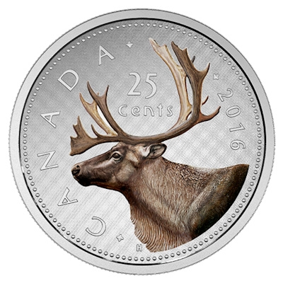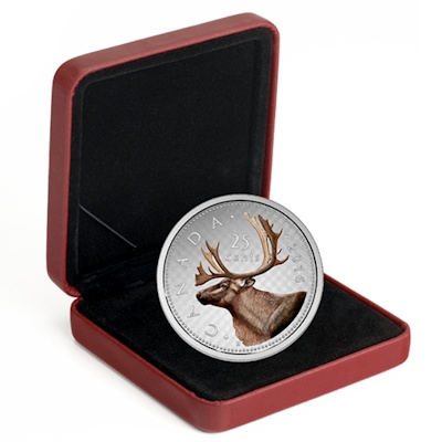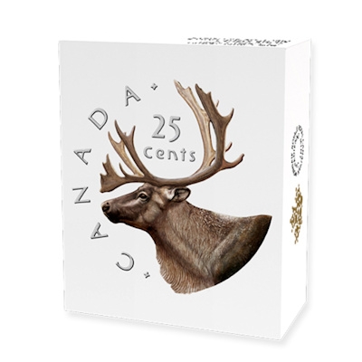 Die Silbermünze zeigt den Kopf eines mächtigen Karibu-Hirschs von der Seite. Sein majestätisches Geweih umrahmt den Nennwert von 25 Cents. Das Design stammt im Original von Emanuel Hahn, einem gebürtigen Deutschen, der 1888 mit seiner Familie nach Kanada auswanderte. Karibus, in Europa als Rentiere bekannt, werden bis zu 300 Kilogramm schwer und sind rund um den Globus in nördlichen Breiten zu finden. Übrigens sind sie die einzigen Hirsche, bei denen auch die weiblichen Tiere ein Geweih tragen.