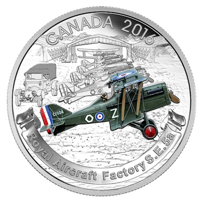 100 Jahre danach inspiriert der Erste Weltkrieg die Royal Canadian Mint zu verschiedenen Sammlerstücken für Geschichtsfans. Ganz neu ist dabei die Silbermünzen-Serie Aircraft of First World War, für die drei Ausgaben geplant sind. Die erste davon zeigt die Royal Aircraft Factory S.E. 5a, eine der entscheidenden Maschinen des Krieges. Das Sammlerstück aus 1 oz Feinsilber ist mit aufwendigen Farbapplikationen gestaltet. Die Auflage ist auf 7.500 Exemplare begrenzt.