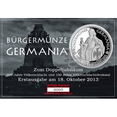buergermuenze-germania-2013-1-oz-silber-blisterAls Stempel ist das Porträt der Königin Elizabeth II aufgebracht, die als Oberhaupt des Commonwealth auch offizielles Staatsoberhaupt Neuseelands ist. Durch ihre Vorfahren ist sie auch Deutschland verbunden: Erst während des Ersten Weltkriegs änderte König George V. den Namen seines Hauses von Sachsen-Coburg und Gotha in Windsor. Die Blisterverpackung erinnert an einen Konflikt, in dem England und die deutschen Staaten Seite an Seite kämpften: In der Völkerschlacht von Leipzig erlangten verbündete Truppen den ersten entscheidenden Sieg über Napoleon.