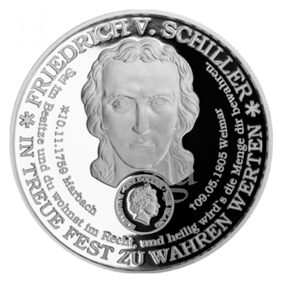 buergermuenze-germania-2013-1-oz-silber-schillerDie Bürgermünze Germania war 2013 die erste ihrer Art. Sie enthält 1 oz Feinsilber und wurde sowohl in Spiegelglanz- als auch in Stempelglanzqualität geprägt. Der Durchmesser beträgt 41 Millimeter, der Nennwert liegt bei einem Neuseeland-Dollar. Die Münze hat einen Feingehalt von 999/1000. Gewicht, Feingehalt und Prägejahr sind unterhalb der Darstellung der Germania zu finden. Umseitig ziert ein Porträt Friedrich Schillers die Münze, darunter seine Lebensdaten sowie das Zitat „Sei im Besitze und du wohnst im Recht, und heilig wird’s die Menge dir bewahren“ aus „Wallensteins Tod“.