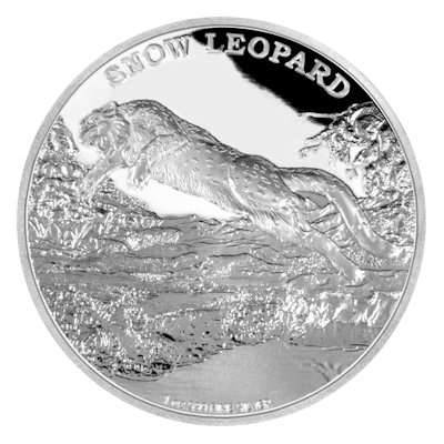 Nur etwa drei- bis siebentausend frei lebende Schneeleoparden durchstreifen Schätzungen zufolge heute noch die mittelasiatischen Hochgebirge. Im Himalaya wagen sich die Großkatzen sogar bis auf 5.500 Meter Höhe vor. Der Schneeleopard wird bis zu 130 Zentimeter lang, dazu kommt noch ein auffällig langer Schwanz. Mit seinem grauen Fell ist er im Gebirge perfekt getarnt und kann sich unbemerkt ganz nah an seine Beute anschleichen, bevor er mit einem kräftigen Sprung angreift. Genau diesen Moment haben die Designer der Silbermünze eingefangen. Das Maul ist bereits zum tödlichen Biss aufgerissen. Gut zu erkennen sind die kräftigen Vorderbeine mit den großen Pfoten und der relativ kleine Kopf, die für die Art typisch sind. Auch die dunkleren Flecken des Leopardenfells zeichnen sich deutlich ab.