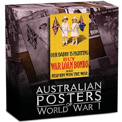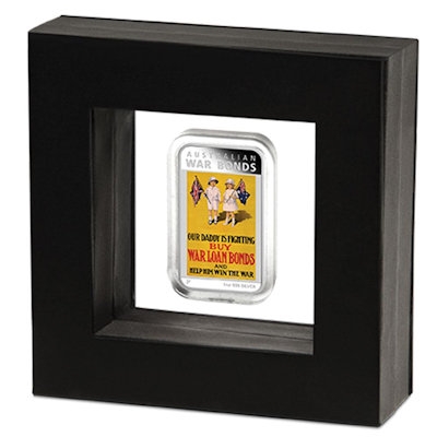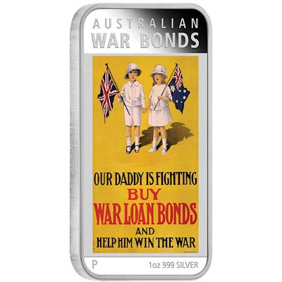 Im Jahr australian-posters-of-wwi-1-oz-silber-koloriert2014, 100 Jahre nach Beginn des Ersten Weltkriegs, startete die Perth Mint die Silbermünzen-Serie „Australian Posters of World War I“, in der jedes Jahr eine Ausgabe erscheint. Nach Enlistment und Red Cross ist jetzt mit War Bonds das dritte Motiv auf dem Markt. Die mit Farbapplikationen gestalteten Sammlerstücke enthalten 1 oz Feinsilber und haben passend zu den nach Original-Postern gestalteten Motiven eine rechteckige Form. Die Auflage ist streng begrenzt auf 5.000 Exemplare.