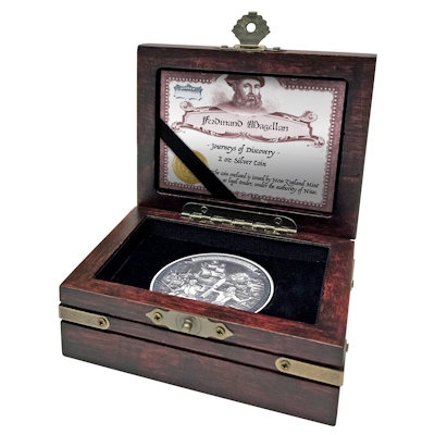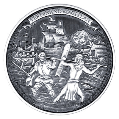 Trotzdem gebührt Magellan ein Platz unter den mutigen Seefahrern der Geschichte. In der Silbermünzen-Serie steht er in einer Reihe mit Marco Polo, Christoph Kolumbus und Vasco da Gama. Die Silbermünze aus 2 Unzen Feinsilber (Feingehalt 999/1000) hat einen Durchmesser von 40 Millimetern. Neben der High-Relief-Prägung weist sie als Besonderheit auch noch ein Antik-Finish auf. Umseitig ist ein Porträt von Königin Elizabeth II. abgebildet; als Ausgabeland gilt Niue. Der Nennwert liegt bei 5 Dollars. Das Sammlerstück ist verpackt in ein Etui, das wie ein hölzernes Schatzkästchen mit Beschlägen gestaltet ist. Die Umverpackung besteht aus einem Beutel mit Kordelzug – so wurden Waren zu Magellans Zeit verpackt. Die Auflage ist auf nur 2.000 Exemplare begrenzt.