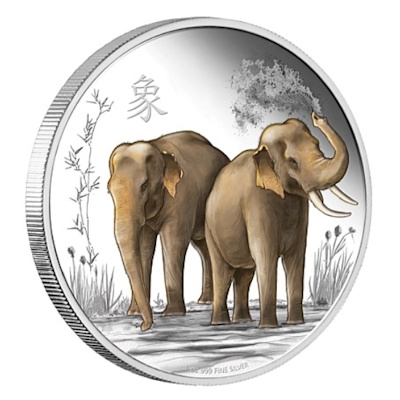 Der Elefant mit erhobenem Rüssel steht für Reichtum, Wachstum und Wohlstand – ein Glückssymbol, das man gern sein Eigen nennt. Aber auch der Elefant mit hängendem Rüssel ist ein positives Zeichen. Er symbolisiert Weisheit und Erfahrung. Auf dem Motiv der Silbermünze sind gleich beide Versionen versammelt, um das Glück sozusagen perfekt zu machen. Die beiden Elefanten sind liebevoll koloriert und heben sich von dem silbernen, spiegelnden Hintergrund ab. Ihre relativ kleinen Ohren zeigen, dass der Asiatische Elefant Vorbild für die beiden war.