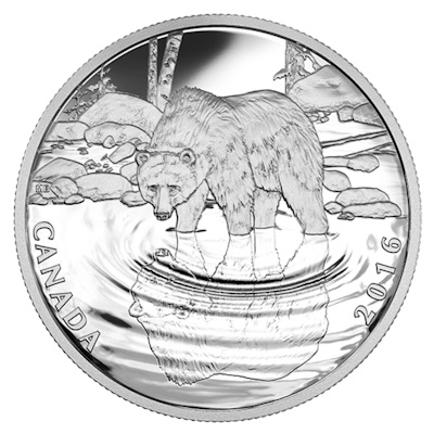 Aus dem Schatten des dichten Waldes ist der mächtige Bär hervorgetreten, angelockt von der spiegelnden Oberfläche eines Weihers. Er ist ein Stückchen hinausgewatet, Wellen kräuseln noch das Wasser und vermitteln den Eindruck von Bewegung. Der Grizzly steht unterdessen ganz ruhig mit gesenktem Kopf da und scheint sein eigenes Spiegelbild zu betrachten. Der typische Nackenhöcker ist besonders deutlich sichtbar. Der Grizzlybär ist eines der wiederkehrenden Motive der Royal Canadian Mint. Erst vor Kurzem widmete die Prägeanstalt ihm eine ganze Serie mit Themen von der Jagd bis zu Paarungszeit und Familie.