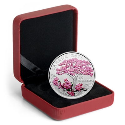 Das Sammlerstück ist in höchster Proof-Qualität geprägt und durch die kunstvollen Farbapplikationen veredelt. Es hat einen Durchmesser von 36,07 Millimetern und ein Gewicht von 23,17 Gramm. Der Feingehalt liegt bei 99,99 Prozent, der Nennwert beträgt 15 CAD und ist rechts neben dem Stamm des Kirschbaums zu finden. Der Münzrand ist geriffelt. Die Silbermünzen werden im Etui und einer passenden Umverpackung ausgeliefert. Die Auflage ist auf 6.500 Exemplare limitiert.