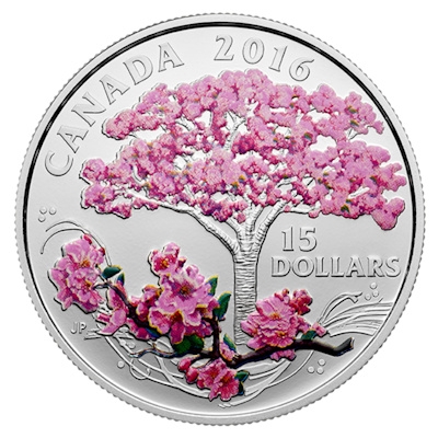 Als Vorbild für das Motiv diente die Japanische Nelkenkirsche, die in Nordamerika häufig als Zierbaum anzutreffen ist. Ihre vollen, intensiv rosa gefärbten Blüten machen sie zu einem Blickfang in den Parks. Die Stadt Vancouver feiert sogar ihr eigenes Kirschblütenfest. Diese Tradition stammt eigentlich aus Japan, wo die Kirschblüte ganze Landstriche in ein Meer zarter Blüten verwandelt. Nur rund zwei Wochen dauert dieses Schauspiel, dann sind die Blüten verwelkt. Langlebiger sind da die Exemplare auf der kanadischen Silbermünze. Sie zeigt im Hintergrund einen Baum in voller Blüte und einen blühenden Zweig im Vordergrund. Das schwungvolle Ornament hinter dem Kirschzweig steht für das Verstreichen der Zeit.