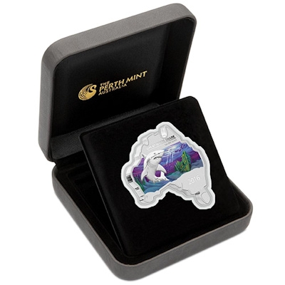 map-shaped-great-white-shark-1-oz-silber-koloriert-shipperDie Silbermünze aus 1 oz Feinsilber (Feingehalt 999/1000) zeigt einen detailreich gestalteten, silbernen Hai vor koloriertem Hintergrund. Neben Wasserpflanzen und Sonnenstrahlen ist ein Schiffswrack zu sehen. Das Sammlerstück hat die Form Australiens auf der Landkarte. Im „Süden“ ist das Prägejahr zu finden, das Zeichen der Perth Mint markiert im Westen die Lage der Stadt Perth. An der breitesten Stelle hat die Silbermünze einen Durchmesser von 40,6 Millimetern. Ein Porträt von Königin Elizabeth II. ziert die Wertseite. Der Nennwert beträgt 1 australischen Dollar. Die Münzen werden mit nummeriertem Echtheitszertifikat, im Etui und Karton im Seriendesign ausgeliefert.