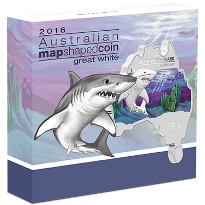 map-shaped-great-white-shark-1-oz-silber-koloriertSchluss mit niedlich scheint das Motto der Perth Mint bei der beliebten Silbermünzen-Serie „Map Shaped“ zu sein. Nach der Rotrückenspinne zeigt die neunte Ausgabe nun mit dem Weißen Hai wieder einen bedrohlichen Vertreter der australischen Tierwelt. Natürlich bietet er aber ein faszinierendes Motiv für die kolorierte Silbermünze in den Umrissen des australischen Kontinents. Die Auflage ist auf nur 6.000 Stück limitiert.map-shaped-great-white-shark-1-oz-silber-koloriert-etui