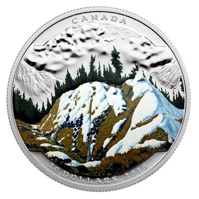 Diese mit aufwendigen Farbapplikationen gestaltete Silbermünze der Royal Canadian Mint zeigt eine Berglandschaft zu Frühlingsbeginn – oder etwa doch nicht? Nichts ist, wie es auf den ersten Blick scheint in der neuen Serie „Landscape Illusion“. Für die erste Ausgabe verwandelt sich ein schneebedeckter Bergrücken durch einen kleinen Perspektivwechsel in eine Bergziege. Vier weitere Editionen sind im Lauf des Jahres geplant, jede mit einer Auflage von 5.500 Exemplaren.