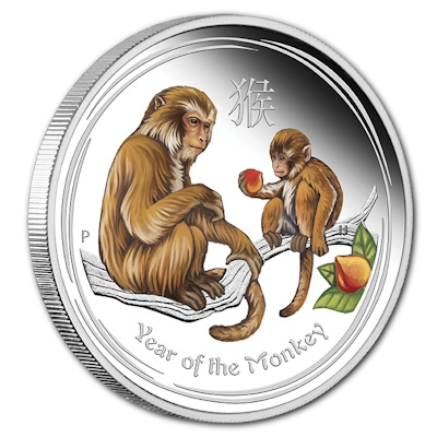 lunar-ii-monkey-2-oz-silber-coin-show-special-koloriert-etuiDas Motiv ist bei allen Silbermünzen der Perth Mint zum Year of the Monkey gleich: Zwei Affen sitzen auf dem Ast eines Pfirsichbaumes. Das Affenkind streckt dem älteren Artgenossen einen Pfirsich entgegen – das Symbol für langes Leben und Unsterblichkeit. Eine weitere Frucht hängt am rechten Rand des Motivs noch am Ast. Die beiden liebevoll gezeichneten Tiere sind bei dieser Ausgabe aufwendig koloriert. Zwischen den Köpfen der Affen findet man das chinesische Schriftzeichen für „Affe“, unten den Schriftzug „Year of the Monkey„. Der Affe ist bereits die neunte Ausgabe der Serie nach Maus, Büffel, Tiger, Hase, Drache, Schlange, Pferd und Ziege.