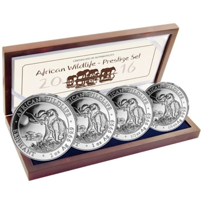 Die African Wildlife Elephant hat sich im Lauf der letzten zehn Jahre als Sammler- und Anlagemünze etabliert. Die Münzen mit wechselndem Elefanten-Motiv sind sowohl in Silber als auch in Gold, in Stempelglanzprägung und in Polierte Platte erhältlich. Eine Besonderheit für Numismatik-Fans ist das Prestige-Set: Es enthält vier Silbermünzen in höchster Prägequalität, wobei drei Stückelungen derzeit nur in diesen Sets ausgegeben werden. Die Auflage beträgt 2.000 Stück.