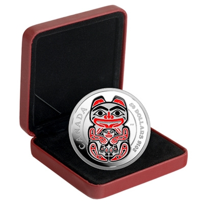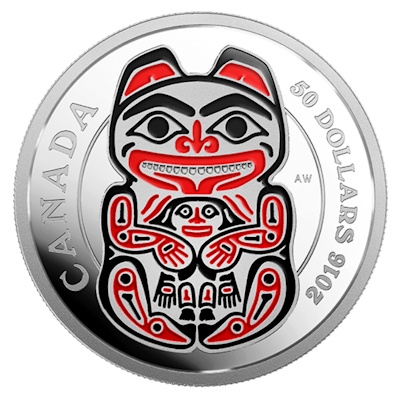 Rot und schwarz sind die traditionellen Farben der Haida-Kunst, die auch für diese Silbermünze verwendet wurden. April White, Mitglied des Raven-Clans, hat das Bären-Motiv für die zweite Ausgabe der Silbermünzen-Serie entworfen. Es stellt einen sitzenden Bären mit einem menschlichen Kind im Arm dar. In den Mythen der Haida kann der Bär als übernatürliches Wesen mit Menschen zusammen Kinder zeugen. Diese Bärenkinder können ihren „Mantel ablegen“ und als Menschen leben. Die herausgestreckte Zunge des Bären steht für Kommunikation: Er gibt sein Wissen an das Kind in seinem Arm weiter.