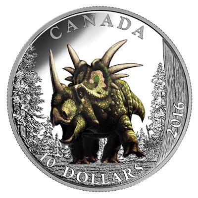 Das Bild des Styracosaurus auf der Silbermünze entspricht dem neuesten Forschungsstand. Der Dino marschiert dem Betrachter entgegen, das lange Horn auf der Nase und die weiteren Hörner am Nackenschild sind gut zu sehen. Styracosaurus wurde gute fünf Meter lang und rund drei Tonnen schwer, ernährte sich aber trotz seines martialischen Aussehens von Pflanzen, die er mit seinem Schnabel auflas. Das kolorierte Urzeittier ist von üppiger Vegetation umgeben, wie sie in Alberta in der späten Kreidezeit, als Styracosaurier das Land durchstreiften, gedieh.