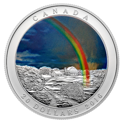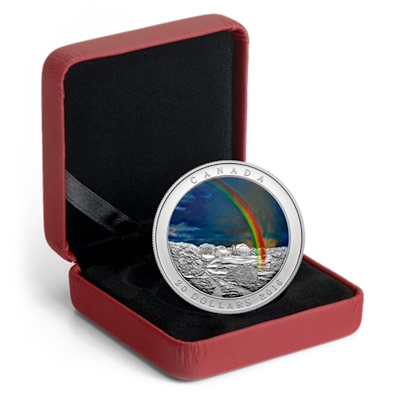 Unterhalb des Motivs findet man den Nennwert von 20 CAD. Die Silbermünze ist in höchster Proof-Qualität geprägt und hat einen Durchmesser von 38 Millimetern. Der Feingehalt liegt bei 99,99 Prozent. Der Rand ist geriffelt, die Rückseite zeigt ein Portrait Königin Elizabeths II. Die Silbermünzen werden im Etui ausgeliefert. Die Auflage ist auf 8.000 Exemplare weltweit limitiert. Nach Sommersturm und Winterfrost ist der Regenbogen bereits die dritte Ausgabe der Wetterphänomene-Serie.