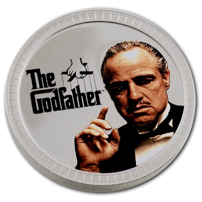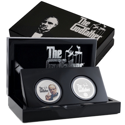 Hauptdarsteller Brando ziert die erste der beiden Sammlermünzen aus jeweils 1 oz Feinsilber. Er ist mit Farbapplikationen gestaltet. Die zweite Silbermünze zeigt neben dem Godfahther-Logo das Logo der Produktionsfirma Paramount. Wenn man sie ein wenig dreht, enthüllt sie außerdem ein Geheimnis: einige dem Mafia-Thema entsprechende Einschusslöcher. Beide Münzen haben einen Durchmesser von 39 Millimetern und einen Feingehalt von 999/1000. Der Münzrand ist geriffelt. Auf der Wertseite ist neben dem Nennwert von 2 Dollars ein Porträt von Königin Elizabeth II. zu sehen. Als Ausgabeland gilt Niue. Die Silbermünzen werden in einem edlen Etui in Klavierlackoptik und zusammen mit einem nummerierten Echtheitszertifikat ausgeliefert.