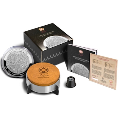 Die Silbermünze hat einen Durchmesser von 110 Millimetern und trägt den Nennwert von 100 Pesos. Damit man die Details des Motivs auch würdigen kann, wird sie mit umfangreichem Zusatzmaterial geliefert: Der Ständer der metallenen Schatulle mit Holzdeckel sorgt für eine stilechte Präsentation, mit einem Vergrößerungsglas lässt sich ganz genau hinsehen und das zugehörige Booklet informiert über die Hintergründe des Kalenders. Ein nummeriertes Echtheitszertifikat wird ebenfalls mit ausgegeben.