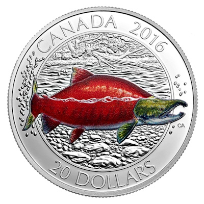 Der Lachs auf der Silbermünze hebt sich mit leuchtenden Farbapplikationen vom silbernen Hintergrund ab. Am Rand findet man den Nennwert von 20 CAD und das Prägejahr. Die Silbermünze hat einen Durchmesser von 40 Millimetern und einen Feingehalt von 99,99 Prozent. Der Rand ist geriffelt. Umseitig zeigt das Sammlerstück ein Portrait von Königin Elizabeth II.