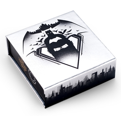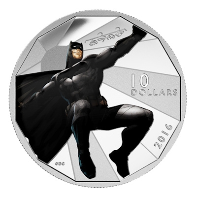 Die Silbermünzen-Serie zeigt die drei Helden des Films und das Superman-Batman-Logo. Der Hintergrund der Münzen ist mit einem speziellen „Zerbrochenes-Glas-Effekt“ gestaltet, der durch das Finish verstärkt wird. Davor ist das kolorierte Bild des Superhelden – in diesem Fall Batman – zu sehen. Das Motiv zeigt den Dark Knight in einer dynamischen Pose im Sprung. Oberhalb seines linken Arms ist sein Name in kryptonischen Schriftzeichen abgebildet, darunter der Nennwert von 10 CAD. Das in Matte Proof geprägte Sammlerstück enthält 1/2 oz Feinsilber (Feingehalt 99,99 Prozent) und hat einen Durchmesser von 34 Millimetern. Der Münzrand ist geriffelt. Umseitig ist ein Porträt von Königin Elizabeth II. zu sehen. Ausgeliefert werden die Silbermünzen mit einer Auflage von 15.000 Stück in einem Etui in Batman-Design.