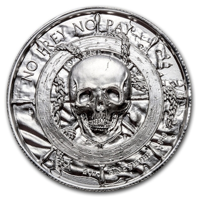 Umseitig zeigt das Silberstück, das keinen Nennwert trägt, das berühmteste aller Piratensymbole: einen wunderbar plastisch herausgearbeiteten Totenkopf. Dahinter ist ein Steuerrad zu erkennen, außerdem die Aufschrift „No Prey No Pay“. Hier findet man auch die Angaben zu Gewicht (2 oz) und Feingehalt (999/1000). Die Ausgabe hat einen geriffelten Rand und einen Durchmesser von 40 Millimetern.