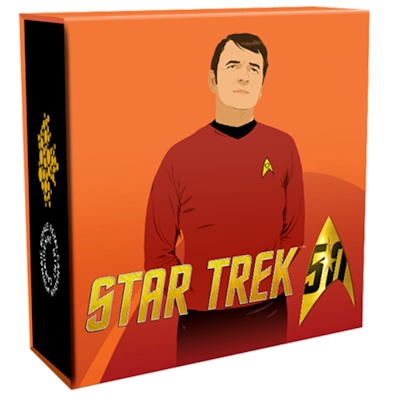 Rote Sternenflotten-Uniform, dunkle Haare, ruhiger, leicht skeptischer Blick – so kennen Star-Trek-Fans Scotty aus der Originalserie. Doohan verpasste der Rolle im Original einen starken schottischen Akzent. Egal, wie kritisch die Situation ist, der Chefingenieur findet für jedes technische Problem eine Lösung. Der Satz „Beam me up, Scotty“ erlangte Bekanntheit weit über die Fangemeinde der ursprünglichen Serie hinaus. Die Silbermünze zeigt den Ingenieur mit einem Kommunikator in der Hand. Das Gerät ist im Hintergrund noch einmal im Detail in Silber zu sehen. Scotty alias Doohan ist mit Farbapplikationen gestaltet.