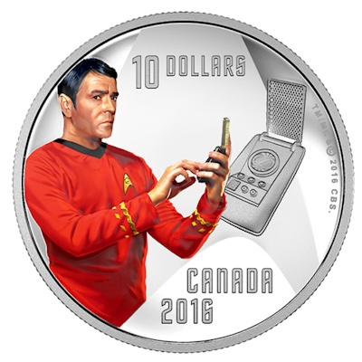 Der Nennwert von 10 CAD ist oben zu finden. Die in höchster Proof-Qualität geprägte Silbermünze hat einen Durchmesser von 34 Millimetern. Sie enthält 1/2 oz Feinsilber bei einem Feingehalt von 99,99 Prozent. Umseitig zeigt das kolorierte Sammlerstück ein Porträt von Königin Elizabeth II. Die Auflage ist auf 12.500 Stück begrenzt. Ausgeliefert werden die Silbermünzen in einem Shipper mit einem Bild des Chefingenieurs. In der vierteiligen Serie folgen noch Uhura und Mr. Spock.