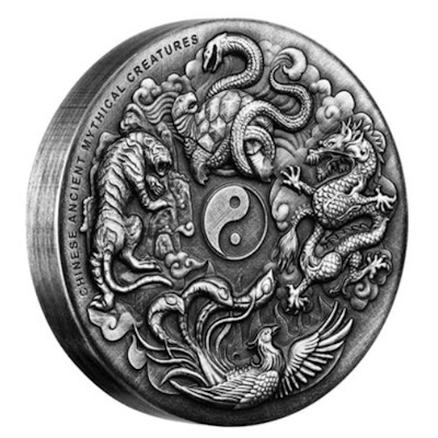 Alle vier mythischen Wesen sind auf der Silbermünze an ihren jeweiligen Positionen zu finden. Sie gruppieren sich dabei rund um ein Yin- und-Yang-Symbol. Die Prägung in High Relief und das Antik-Finish sorgen für ein eindrucksvolles Motiv. Das Sammlerstück hat einen Durchmesser von 40,60 Millimetern und eine Dicke von maximal 6 Millimetern. Der Feingehalt liegt bei 999/1000. Umseitig zeigt die Münze aus 2 oz Feinsilber ein Porträt von Königin Elizabeth II. Sie gilt als gesetzliches Zahlungsmittel in Tuvalu mit dem Nennwert von 2 Dollars. Der Münzrand ist geriffelt. Ausgeliefert werden die Silberstücke in einem Präsentationetui aus Plexiglas und einem schön gestalteten Shipper, der die Sagentiere zeigt. Die Auflage ist auf 1.500 Exemplare beschränkt.