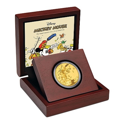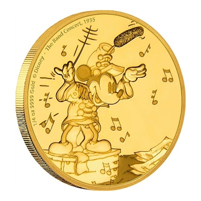 disney-classics-mickey-mouse-band-concert-quarter-oz-goldIn der Serie Disney Classics schlägt die New Zealand Mint ein neues Kapitel auf: Micky Maus im Wandel der Zeiten (Mickey Through the Ages). Eine Ausgabe ist dabei dem Zeichentrrickklassiker The Band Concert von 1935 gewidmet. Die Goldmünze aus 1/4 oz Feingold zeigt Micky als Dirigenten umgeben von Noten. Sie wird in einem stilvollen Holzetui ausgeliefert und hat eine limitierte Auflage von nur 1.000 Exemplaren.