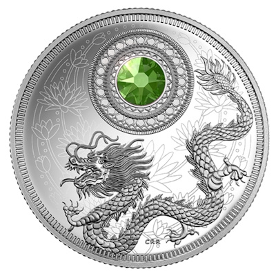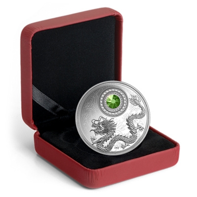 Der grüne Kristall ist in der oberen Hälfte der Silbermünze platziert. Er ist umgeben von asiatischen Glückssymbolen: Ein chinesischer Drache ringelt sich unterhalb des Steins. Den Hintergrund bilden fein gezeichnete Lotusblüten, die als Symbol der Reinheit gelten. Das Sammlerstück hat einen Durchmesser von 27 Millimetern und ist in höchster Proof-Qualität geprägt. Es enthält 1/4 oz Feinsilber bei einem Feingehalt von 99,99 Prozent. Der Rand ist geriffelt. Umseitig zeigt die Münze ein Porträt von Königin Elizabeth II. und den Nennwert von 5 CAD. In der insgesamt zwölfteiligen Serie sind bereits die Geburtssteine für Januar (Granat) , Februar (Amethyst), März (Aquamarin), April (Diamant) , Mai (Smaragd), Juni (Perle) und Juli (Rubin) erschienen.