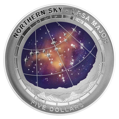 Durch die konkave Form der Silbermünze wird das Himmelsgewölbe plastisch dargestellt. Die Kolorierung lässt die Sterne vor dunklem Nachthimmel leuchten. Am Rand findet man oben den Namen „Ursa Major“, unten den Nennwert von 5 Dollars. Das Sammlerstück hat einen Durchmesser von 39,62 Millimetern und einen glatten Rand. Es ist in höchster Proof-Qualität geprägt. Umseitig ist ein Porträt von Königin Elizabeth II. zu sehen. Der Feingehalt liegt bei 999/1000. Die Silbermünze wird in einem stilvollen Etui und passenden Karton ausgeliefert. Die Auflage ist auf 5.000 Exemplare limitiert.