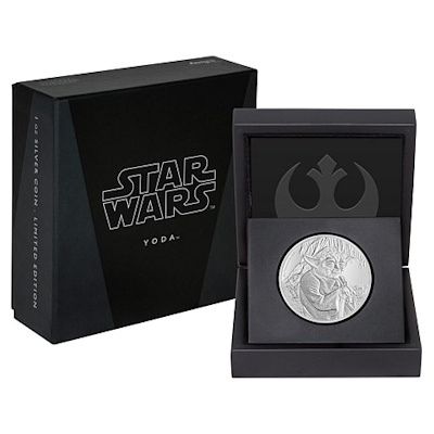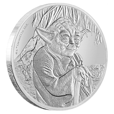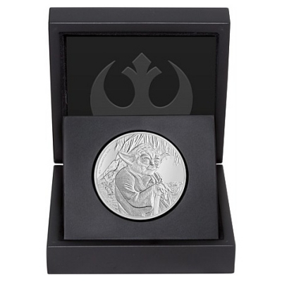 star-wars-yoda-1-oz-silber-pp-verpackungWeise und friedlich präsentiert sich Yoda auch auf dem Motiv der Silbermünze. Diese ist ein lizensiertes Produkt der Lucasfilm Ltd, wie an der Aufschrift am Rand zu sehen ist. Das Sammlerstück hat einen Durchmesser von 40 Millimetern und einen Feingehalt von 999/1000. Es enthält 1 oz Feinsilber. Ausgabeland ist Niue, die Rückseite zeigt das Porträt der Queen und den Nennwert von zwei Dollars. Ausgeliefert werden die Silbermünzen in einem Etui und mit Umverpackung im Star-Wars-Design. Die Auflage ist auf 10.000 Exemplare begrenzt. Zusätzlich zu den „Klassikern“ bringt die New Zealand Mint auch eine Serie kolorierter Silbermünzen mit den Helden aus dem neuesten Star-Wars-Abenteuer Episode VII heraus.