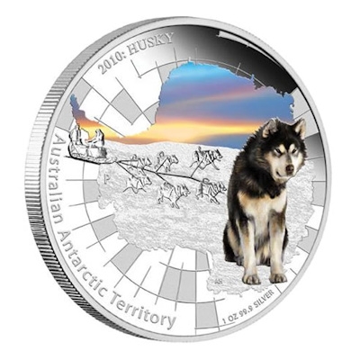 australian-antarctic-territory-2010-husky-1-oz-silber-koloriertSeit 2004 entführt die Perth Mint Münzsammler mit der Silbermünzen-Serie „Australian Antarctic Territory“ in die eisige Welt der Antarktis. Dort beansprucht Australien südlich des 60. Breitengrads das Gebiet zwischen dem 160. und 45. Längengrad mit Ausnahme eines schmalen Streifens. Auf diesem unwirtlichen Fleckchen Erde trifft man faszinierende Tiere und Naturphänomene – viel bequemer holt man sie sich aber auf den hochwertigen kolorierten Münzen aus 1 oz Feinsilber nach Hause. Die Ausgabe 2010 zum Beispiel zeigt den Husky.