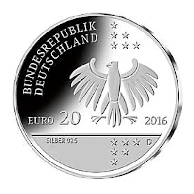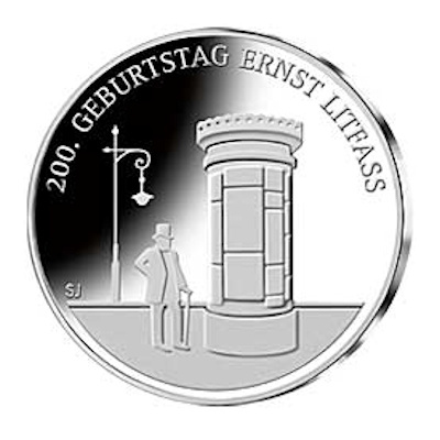 Seit diesem Jahr gibt die Bundesrepublik Deutschland Silbermünzen mit dem Nennwert von 20 Euro heraus, die aus Sterlingsilber bestehen und ein Gewicht von 18 Gramm haben. Inzwischen ist die dritte Ausgabe dieser Nachfolger für die bisherigen 10-Euro-Silbermünzen erschienen. Zu Ehren seines 200. Geburtstags im Jahr 2016 ist sie dem Drucker und Verlerger Ernst Litfaß gewidmet – dem Erfinder der nach ihm benannten Litfaßsäule.