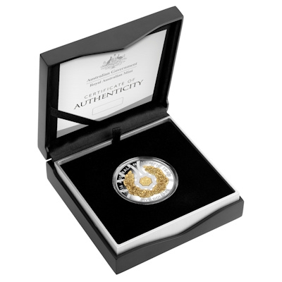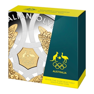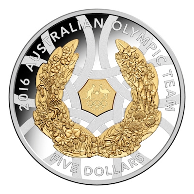 australian-olympic-team-2016-1-oz-silber-vergoldet-etuiIm Mittelpunkt des Motivs steht das Logo des australischen Olympia-Teams. Es zeigt ein Känguru und einen Emu, darunter die Olympischen Ringe. Das Logo ist von sieben ineinandergreifenden silbernen Ringen umgeben, die den Zusammenhalt unter den Teammitgliedern symbolisieren. Darüber liegt eine Art Siegerkranz, der jedoch nicht aus Lorbeerblättern besteht, sondern aus den floralen Emblemen der einzelnen Staaten und Territorien. Oben findet man den Schriftzug „Australian Olympic Team“, unten den Nennwert von 5 Dollars.