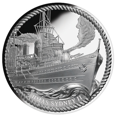 Die Silbermünze zeig die „Sydney“, wie sie mit rauchenden Schornsteinen stolz durch die Wellen pflügt. Der Leichte Kreuzer hatte eine Länge von 169 Metern. Er verfügte über 8-Zoll- und 4-Zoll-Geschütze, Torpedorohre und ein Bordflugzeug. Rauchschwaden zeigen an, dass zwei der Geschütze gerade abgefeuert worden sind. Die High-Relief-Prägung hebt die Details eindrucksvoll hervor. Das Motiv wird von einem Schiffstau umrahmt; unten findet man den Namen des Schiffs.