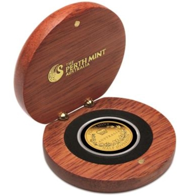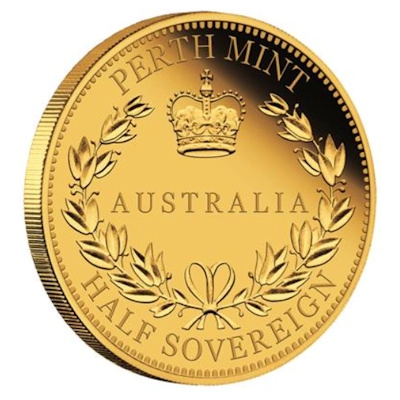 australia-half-sovereign-2016-gold-etuiAustraliens erste Prägeanstalt in Sydney stellte ab 1855 den Australia Sovereign und Half Sovereign her. Für das Design war Leonard Charles Wyon verantwortlich, der während der Regierungszeit von Königin Victoria zahlreiche Münzmotive entwarf. Während die Sovereigns bis 1931 geprägt wurden, endete die Produktion der Half Sovereigns bereits 1918. Das Motiv zeigt bei beiden die St.-Edwards-Krone über einem Lorbeerkranz. Die Inschrift Perth Mint am oberen Rand und Half Sovereign am unteren sind moderne Ergänzungen des historischen Bilds.