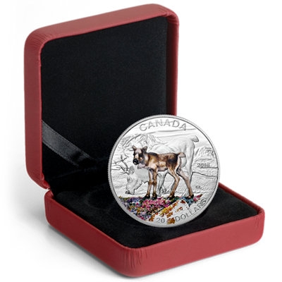 Barren ground caribou kommen in Kanada vor allem in den Nordwest-Territorien, in Nunavut und in Yukon vor. Außerdem sind sie in Grönland beheimatet. Außerhalb der Wanderzeiten leben die Tiere meist in reinen Männchen- bzw. Weibchengruppen. Im Frühjahr, wenn die karge Tundra sich plötzlich in ein buntes Blütenmeer verwandelt, kommen die Jungtiere zur Welt. Schon nach rund einer Stunde stehen sie sicher auf ihren langen Beinchen, bald sind sie in der Lage, neben ihrer Mutter herzulaufen. Das Kälbchen auf der Silbermünze ist liebevoll koloriert mit braunen und hellen Fellpartien, von denen sich Nase, Hufe und die großen Augen dunkel abheben. Das Jungtier und seine Mutter stehen auf einem ebenfalls mit Farbapplikationen gestalteten frühlingshaften Blütenteppich.