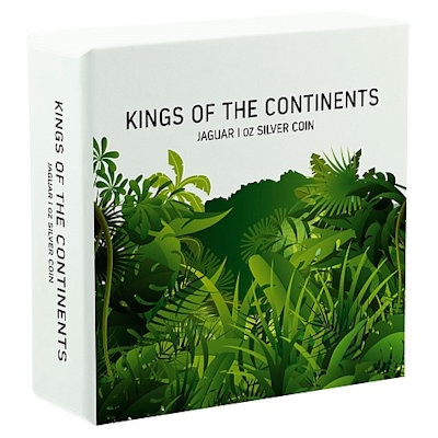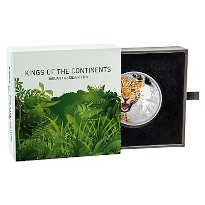 kings-of-the-continents-jaguar-1-oz-silber-koloriert-shipperDas Motiv der Silbermünze präsentiert einen fauchenden Jaguar umgeben von der üppigen Vegetation des Regenwalds. Mit gelblichem Fell und dunklen Flecken ist dieses Tier ein typischer Vertreter seiner Art. Die Silbermünze hat einen Durchmesser von 40 Millimetern und einen geriffelten Rand. Sie enthält 1 oz Feinsilber (Feingehalt: 999/1000). Die Wertseite zeigt das Rank-Broadley Porträt von Königin Elizabeth II und den Nennwert von 2 Dollars. Als Ausgabeland fungiert die Insel Niue. Ausgeliefert wird die Münze in einem Schiebeetui im Seriendesign.