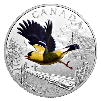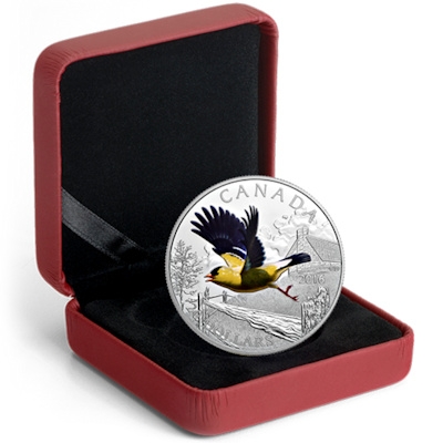 colourful-birds-of-canada-goldfinch-1-oz-silber-koloriert-etuiDas Jubiläum 100 Jahre  Migratory Birds Convention lieferte den Anlass für die Serie. Dieses Abkommen zwischen den USA und Kanada wurde zum Schutz der Zugvögel getroffen. Zu diesen gehört auch der Goldzeisig, obwohl er sich nur eine relativ kurze Strecke in den Süden bewegt, wenn der Winter kommt. Der kleine Vogel mit dem gelben Gefieder, der schwarzen Kappe und den schwarzen Flügeln lässt sich in vielen Gärten Kanadas beobachten, denn er bevorzugt einen offenen Lebensraum. Außerdem profitiert der Samenfresser gerade in der kalten Jahreszeit davon, dass die Menschen Futter für ihn bereitstellen. Die grellen Farben tragen die Männchen übrigens nur im Sommer; im Winter sind sie ähnlich wie die Weibchen dezent olivbraun gefärbt.
