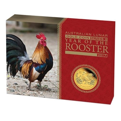lunar-ii-year-of-the-rooster-1-oz-gold-pp-etuiDass der Hahn sich gern in der Bewunderung anderer sonnt, ist dem Tier auf dem Motiv der Lunar-Goldmünze anzusehen. Ansonsten gelten Menschen, die unter dem Zeichen des Hahns geboren sind, als sehr ehrlich und offen. Sie sagen, was sie denken und stehen zu ihrem Wort. Obwohl sie sehr gesellig sind, bleiben sie im tiefsten Inneren doch Einzelgänger und brauchen immer Rückzugsmöglichkeiten, um sich wohl zu fühlen. Das letzte Jahr des Hahns war 2005; auch wer 1921, 1933, 1945, 1957, 1969, 1981 oder 1993 geboren ist, hat gute Chancen, zu den Hähnen zu gehören. Das chinesische Neujahr fällt immer auf einen Tag zwischen Ende Januar und Ende Februar – 2017 ist es der 28. Januar.