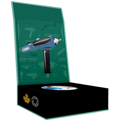 canada-star-trek-spock-half-oz-silber-koloriert-etuiDer Phaser ist die Standardwaffe der Sternenflotte. Das Gerät sendet einen Energiestrahl aus, der die getroffene Lebensform töten oder auch nur betäuben kann. Auf dem Motiv der Silbermünze hält Spock die Waffe vor sich und blickt aufmerksam einer unbekannten Gefahr entgegen. Der typische akkurate Haarschnitt und die spitzen Ohren der Vulkanier machen ihn unverkennbar. Er trägt die blaue Uniform des Ersten Offiziers. Für Schauspieler Leonard Nimoy, der 2015 starb, war Spock die Rolle seines Lebens, in die er auch für die neuen Star-Trek-Filme noch einmal schlüpfte.