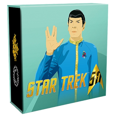 canada-star-trek-spock-half-oz-silber-koloriert-verpacktWährend Spock mit Farbapplikationen gestaltete ist, ist der Phaser auf der Münze in Silber zu sehen. Oberhalb des Motivs findet man den Nennwert von 10 CAD. Die in höchster Proof-Qualität geprägte Silbermünze hat einen Durchmesser von 34 Millimetern. Sie enthält 1/2 oz Feinsilber bei einem Feingehalt von 99,99 Prozent. Der Münzrand ist geriffelt. Umseitig zeigt das kolorierte Sammlerstück ein Porträt von Königin Elizabeth II. Ausgeliefert werden die Silbermünzen in einem Shipper, auf dem Spock den Vulkaniergruß zeigt. Die Auflage ist auf 12.500 Stück limitiert. Die Silbermünze Spock bildet den Abschluss der Serie. Bereits erschienen sind die Ausgaben Kirk, Scotty und Uhura.