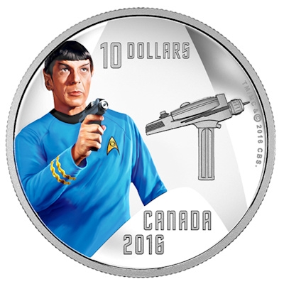 canada-star-trek-spock-half-oz-silber-koloriertLebe lang und in Frieden! Die letzte Ausgabe der Silbermünzen-Serie Star Trek Crew, die die Royal Canadian Mint zum 50. Geburtstag der Kultserie herausgibt, zeigt Mr. Spock. Der Vulkanier, dargestellt von Leonard Nimoy, ist sicher eine der beliebtesten und markantesten Figuren aus „Raumschiff Enterprise„. Außerdem stellt das kolorierte Sammlerstück aus 1/2 oz Feinsilber auch noch ein berühmtes Stück Star-Trek-Technik vor, nämlich die Phaser-Pistole.