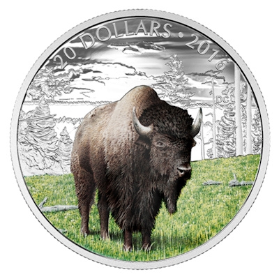 Ruhig und fast sanftmütig blickt der Büffel dem Betrachter von der Silbermünze entgegen. Schließlich ist sie auch „Benevolent Bison“, also „Wohlwollender Bison“, betitelt. Als größtes Landsäugetier Nordamerikas hat der Bison auch nur wenig zu befürchten. Wölfe machen zwar Jagd auf die großen Rinder, werden allerdings nur jungen oder geschwächten Tieren gefährlich. Die Silbermünze zeigt den Bison auf einer Waldlichtung. Sowohl das Tier mit dem zottigen, schwarzbraunen Fell als auch das hellgrüne Gras sind mit Farbapplikationen gestaltet. Dahinter erheben in Silber hohe Bäume.