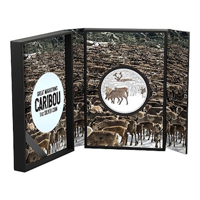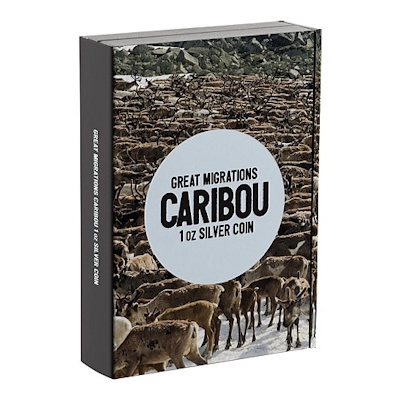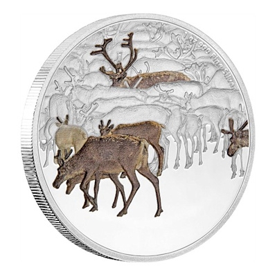 Auf der Silbermünze ist eine große Karibuherde zu sehen. Einige der Tiere sind mit Farbapplikationen hervorgehoben: Ein paar Weibchen im Vordergrund, die an ihrem kürzeren Geweih zu erkennen sind, und ein Männchen mitten in der Herde mit stattlichen Geweihstangen. Das Sammlerstück aus 1 oz Feinsilber (Feingehalt 999/1000) hat einen Durchmesser von 40 Millimetern und einen geriffelten Rand. Den Nennwert von 2 Dollars findet man umseitig, zusammen mit einem Porträt von Königin Elizabeth II. Ausgabeland ist die Insel Niue. Die in höchster Proof-Qualität geprägte Sammlermünze ist in ein stilvolles Etui zum Aufklappen verpackt, das ebenfalls eine Karibuherde zeigt und dem Münzsammler noch einmal das gewaltige Ausmaß der Karibuwanderung vor Augen führt. Die Auflage ist aus nur 3.000 Stück limitiert.