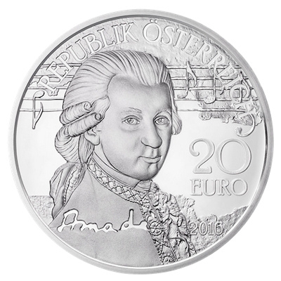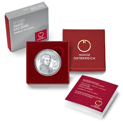 Mit einer dreiteiligen Silbermünzen-Serie feiert die Münze Österreich Wolfgang Amadeus Mozart. Nach der ersten Ausgabe, die das Wunderkind Mozart zeigt, folgte die zweite unter dem Motto „Mozart – das Genie“. Sie zeigt den weltberühmten Komponisten als Erwachsenen auf der Höhe seines Schaffens. Das Sammlerstück für Musikliebhaber enthält 18 Gramm Feinsilber und ist in höchster Proof-Qualität geprägt. Die Auflage ist auf 50.000 Exemplare beschränkt.