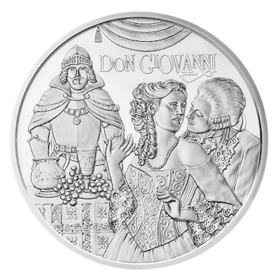 Auch die Oper „Don Giovanni“ stammt aus den Wiener Jahren. Ihr ist die Rückseite der Silbermünze gewidmet. Vorbild war eine Szene aus dem zweiten Akt; im Vordergrund sieht man Don Giovanni mit Donna Elvira, links im Hintergrund steht die Statue des Komturs am gedeckten Tisch. Die Silbermünze hat einen Durchmesser von 34 Millimetern. Der Nennwert von 20 Euro ist neben dem Mozartbild zu finden. Die Wertseite wird vom mittleren Teil der Unterschrift des Komponisten komplettiert – „Amadé“. Das Sammlerstück hat ein Feingewicht von 18 Gramm und einen Feingehalt von 900/1000. Der Münzrand ist glatt. Die Münze wurde gekapselt und in einem roten Shipper der Münze Österreich ausgeliefert. Die Auflage ist auf 50.000 Exemplare limitiert