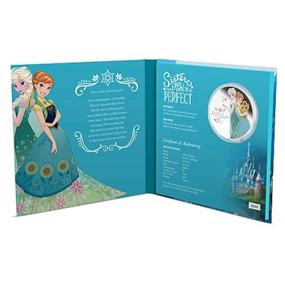 disney-frozen-sisters-1-oz-silber-koloriert-shipperDie Münze aus 1 oz Feinsilber (Feingehalt 999/1000) hat einen Durchmesser von 40 Millimetern und einen geriffelten Rand. Das Ausgabeland ist Niue, der Nennwert beträgt 2 Dollars. Beides ist umseitig zusammen mit einem Porträt von Königin Elizabeth II. zu finden. Das Etui zeigt das Motiv der Silbermünze, nur dass die Schwestern hier vollständig zu sehen sind und Annas Blumenstrauß fehlt. Außerdem enthält es eine kurze Zusammenfassung der Filmhandlung.