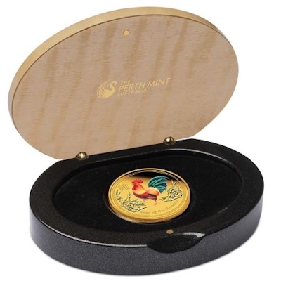 lunar-ii-rooster-1-oz-gold-koloriert-shipperDas goldene Sammlerstück enthält 1 oz Feingold (Feingehalt: 99,99 Prozent) und hat einen Durchmesser von 39,34 Millimetern. Umseitig findet man den Nennwert von 100 australischen Dollars unter einem Porträt von Königin Elizabeth II. Die Auflage ist auf nur 3.000 Exemplare begrenzt. Die Goldmünzen werden mit nummeriertem Echtheitszertifikat, in einem ovalen Etui mit Holzdeckel und einer Umverpackung im Seriendesign ausgeliefert. Das Jahr des Hahns beginnt am 28. Januar 2017.
